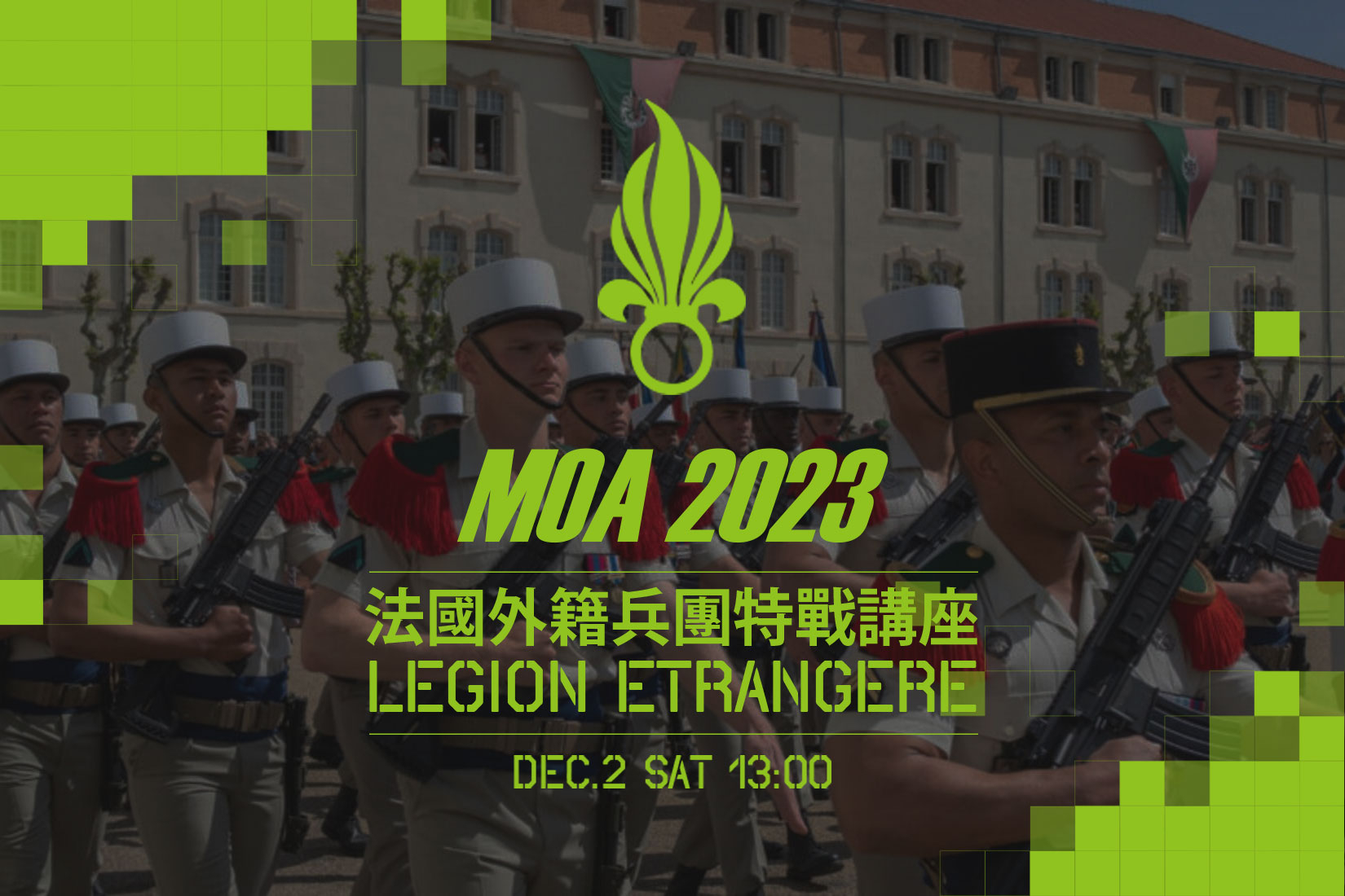 法國外籍兵團特戰講座 | LEGION ETRANGERE SEMINAR 發布日期:27 Oct 2023 鏘鏘鏘、看過來!!! 今年MOA我們很榮幸能邀請到幾位剛從法國外籍兵團退伍的“新鮮”老兵前來,以講座的形式分享他們在兵團裡的生活、訓練等等經驗,對兵團充滿憧憬與嚮往的朋友們千萬別錯過啦! 講座時間:2023年12月2日(六)下午13:00,MOA主舞台